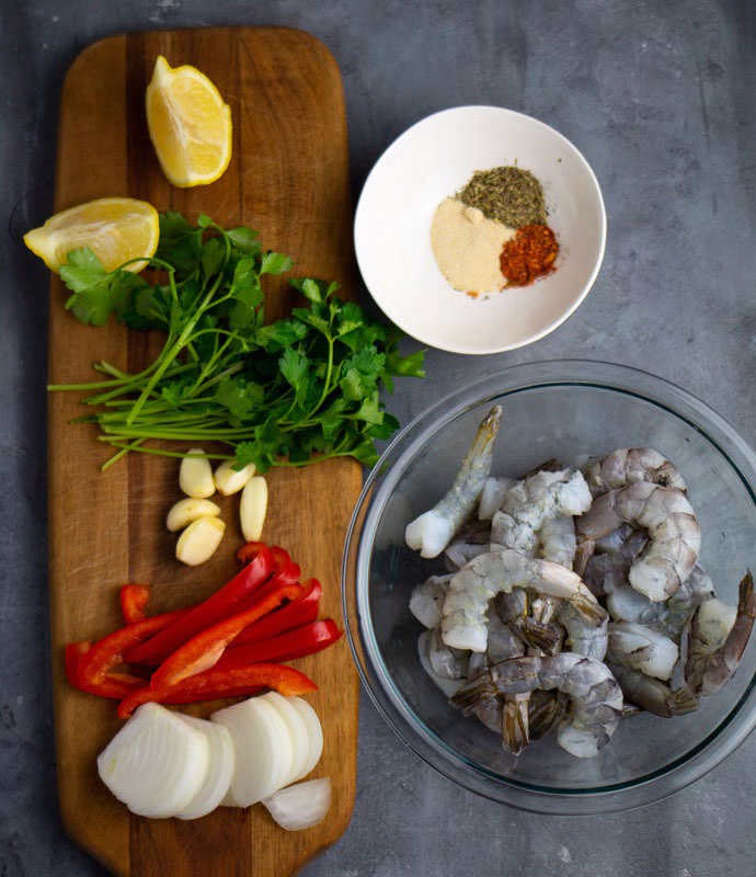 Place the shrimp in a bowl and coat the shrimp in olive oil. Then mix the seasonings together and add them to the shrimp.Then add in the garlic cloves and mix everything together.